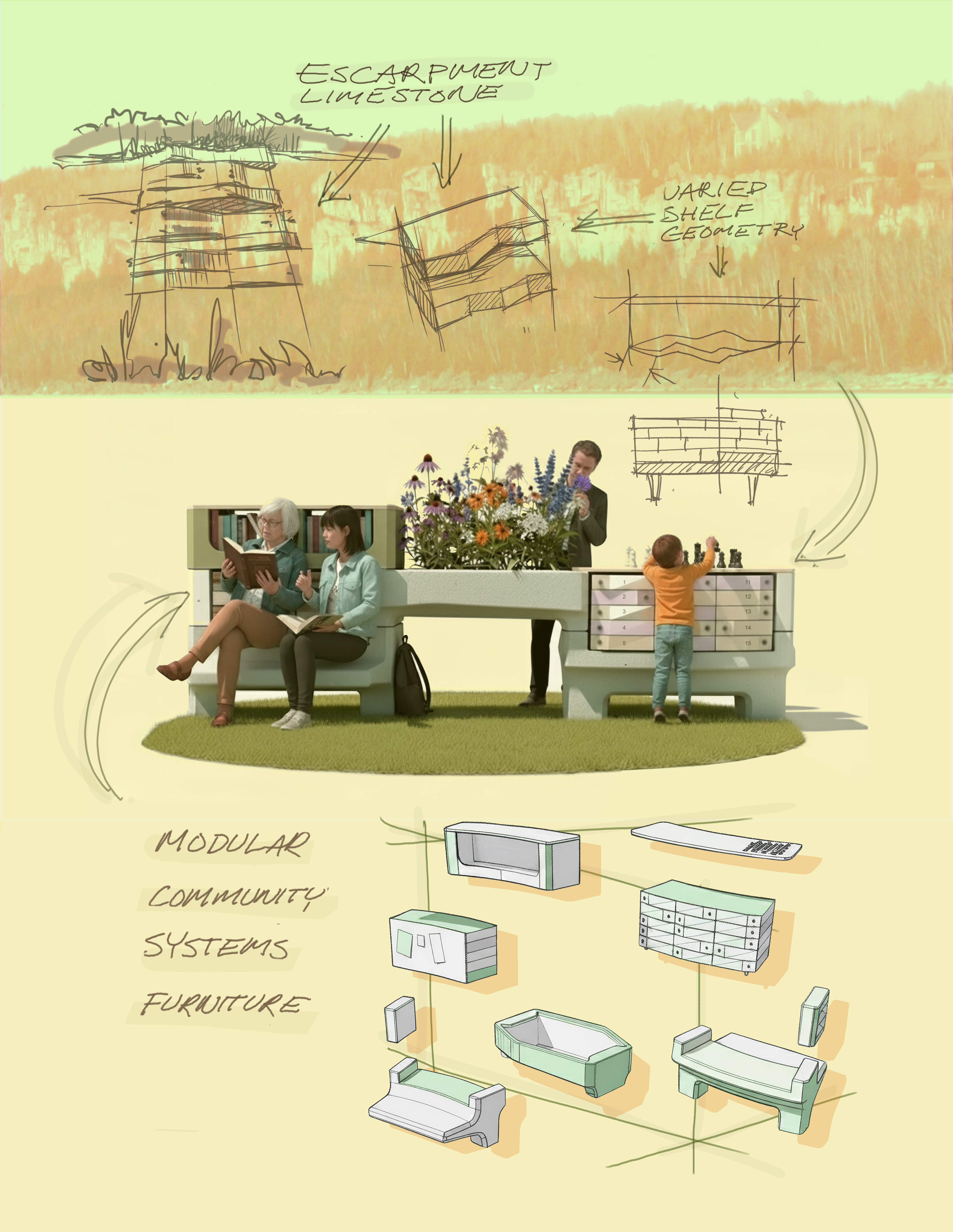In this prototype, we’ve gone bigger, taking visual inspiration from the Niagara Escarpment to support the everyday activities of a flourishing neighbourhood: reading, lending, sharing, eating, drinking, planting and learning. Because each community is unique while community mailboxes must be somewhat uniform, we propose a modular design system, like a giant Lego set (or, since we’re Canadian, Mega Bloks).
