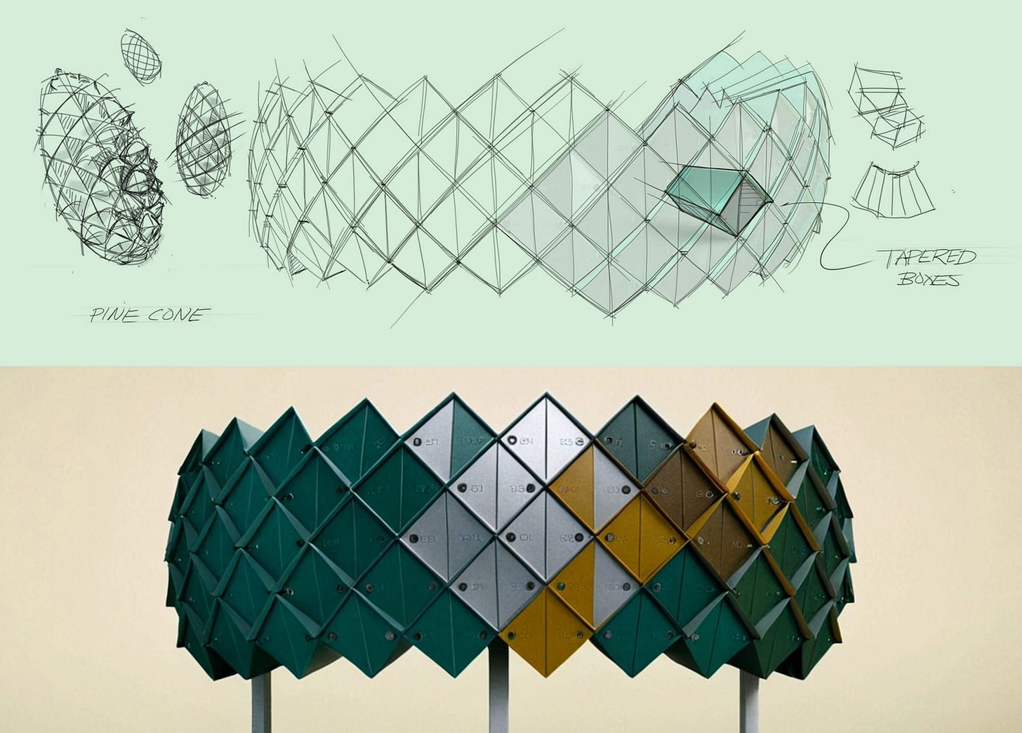 We started with the pine cone – or, more broadly, the cones of coniferous trees. Conifers cover much more of our country than the maple, pushing further north. Their scales protect the seeds and open to release them. That led us to the doors of our mailbox: spiralling tiles that hold your mail, echoing the pattern of a cone.