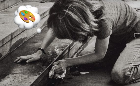 The patron saint of modern maintenance is the artist Mierle Laderman Ukeles. She is the living response (at age 87!) to Cyril Connolly’s observation that “there is no more somber enemy of good art than the pram in the hall.” Ukeles was an accomplished artist when she had her first child in 1968, and said child went into that pram. (“Push me,” said child.) And, Ukeles recalls, “people said to me, when they saw me pushing my baby carriage, “Do you do anything?“...Then I had an epiphany... I have the freedom to name maintenance as art. I can collide freedom into its supposed opposite and call that art. I name necessity art.”